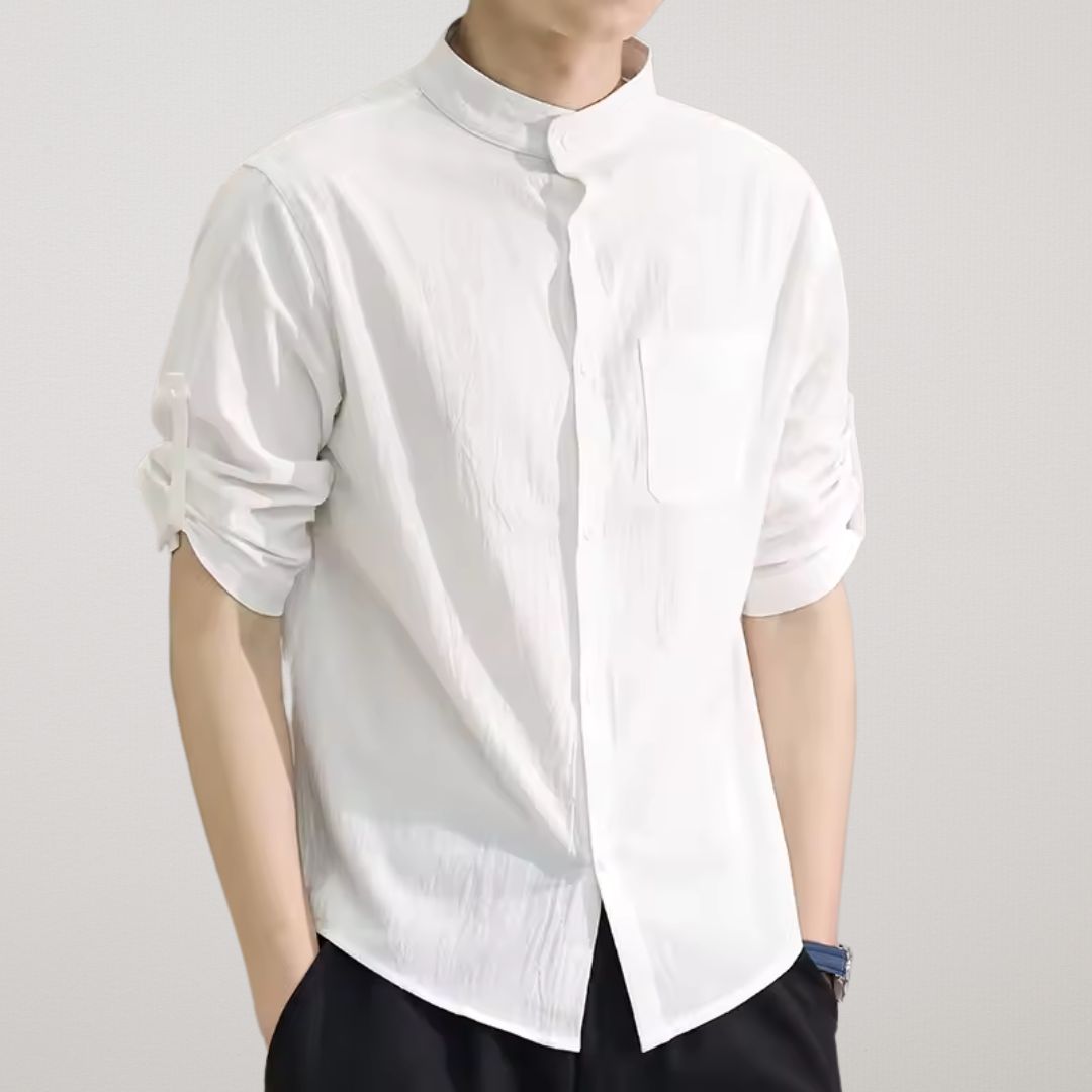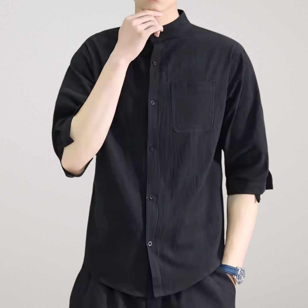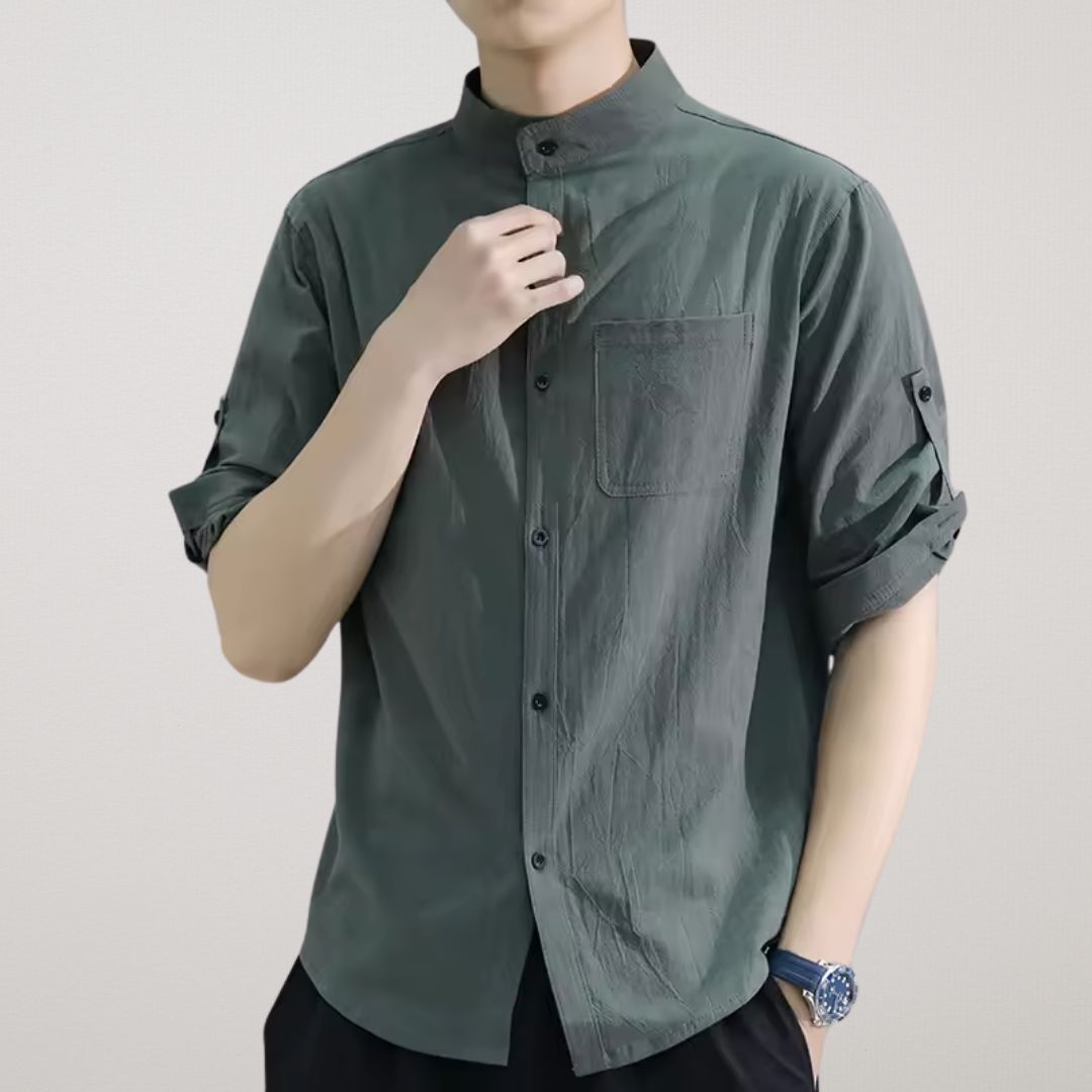 Rafineeritud, kuid samas pingevaba – see kerge puuvillane nööpidega särk on loodud ajatu elegantsi tagamiseks. Moodsa mandariinikrae, peene tekstuuriga viimistluse ja üleskääritavate varrukatega on see ideaalne stiili ja mugavuse segu. Olenemata sellest, kas oled riietatud pidulikult või argiselt, tagab see mitmekülgne rõivas, et sa alati silma paistad.